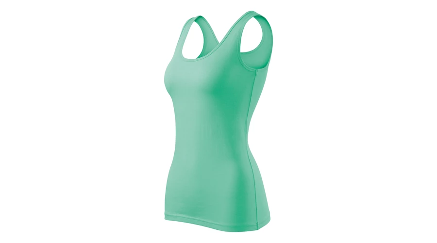 Szűk ujjatlan női felső, széles pántokkal. Megnövelt hosszúság. Kellemes anyag 5 % spandex adalékkal, ami biztosítja a póló alaktartását.